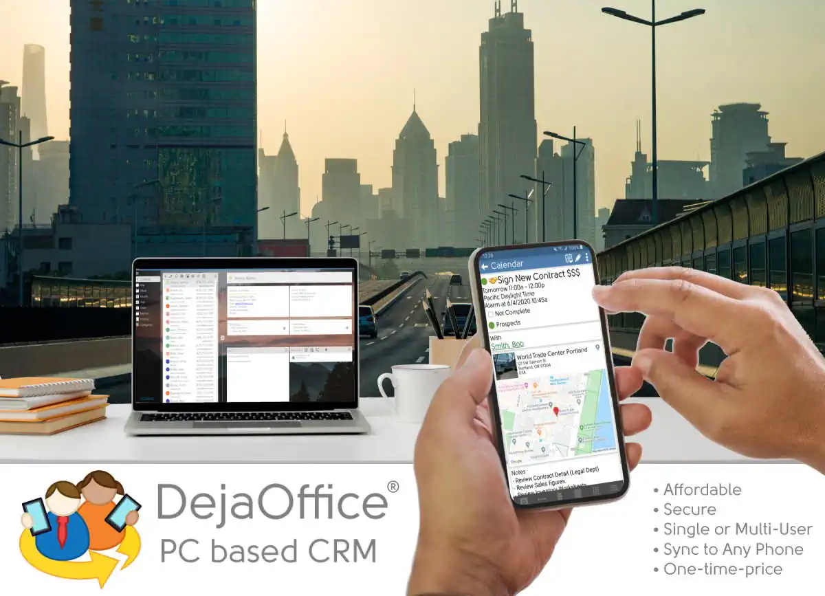 DPC Pro is a full featured CRM for Windows. Your shared SQL database sits on your office network (or locally connected by Sync) — changes to Contacts, Calendar and Tasks are visible to everyone. Sync to Android & iPhone via USB, Wi‑Fi, Bluetooth, or DejaCloud.